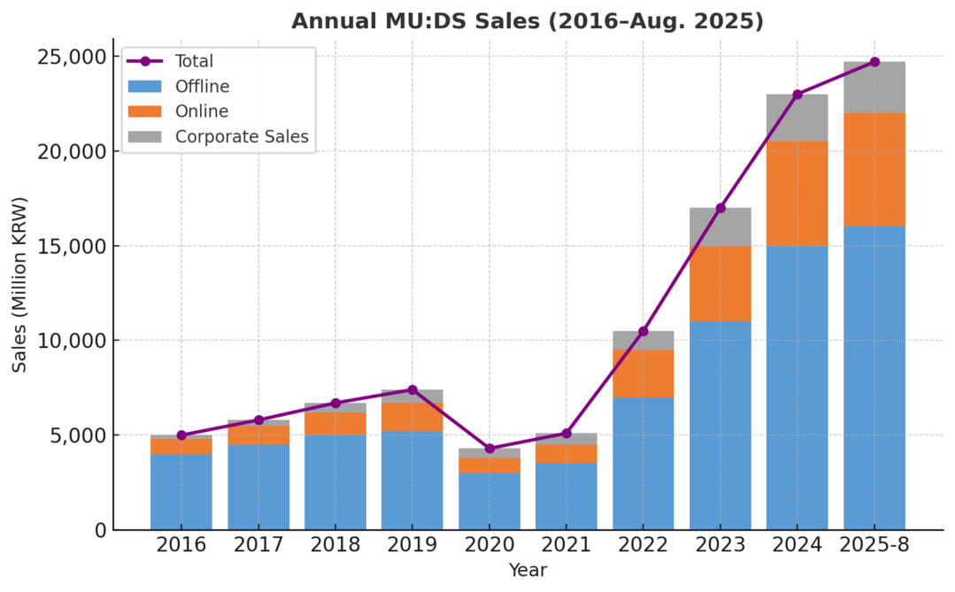 The brand’s growth trajectory has been striking: from 6.1 billion KRW in 2016 to 21.3 billion KRW in 2024, a 3.5-fold increase. If the current pace continues, MU:DS is projected to reach 30 billion KRW by the end of this year.